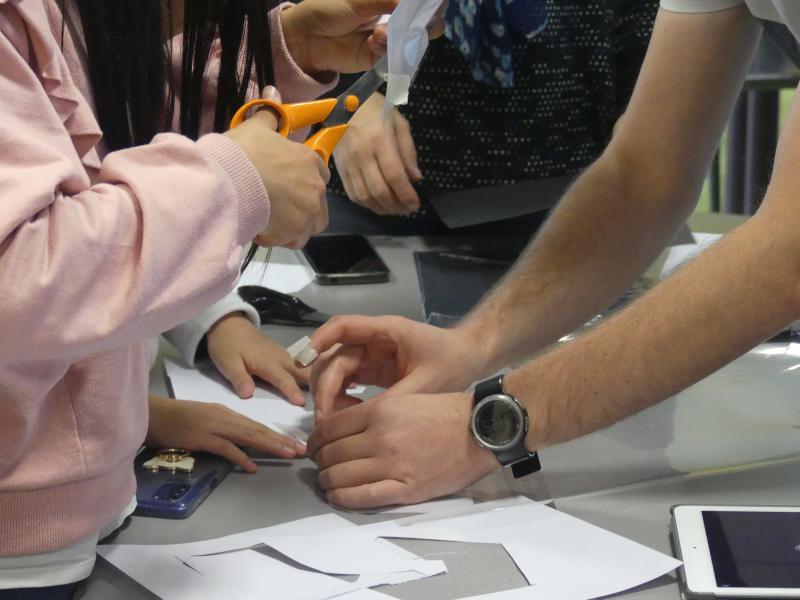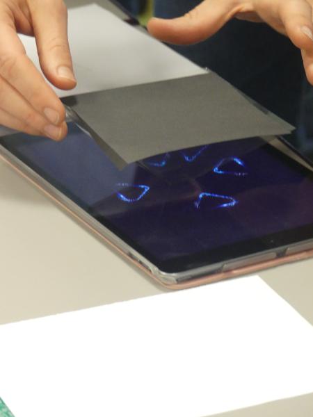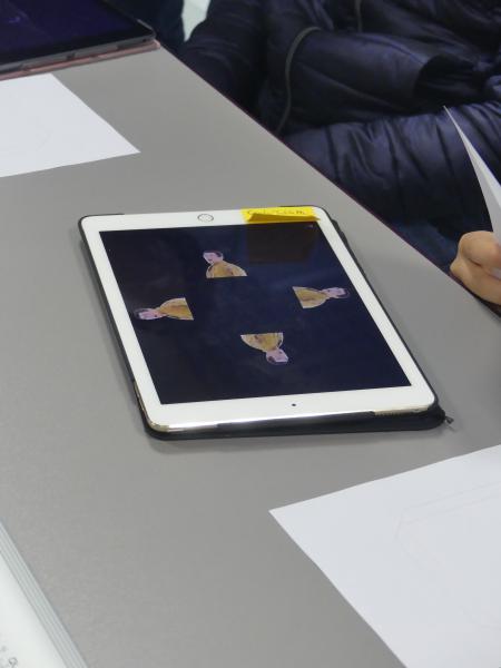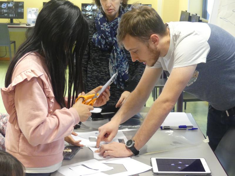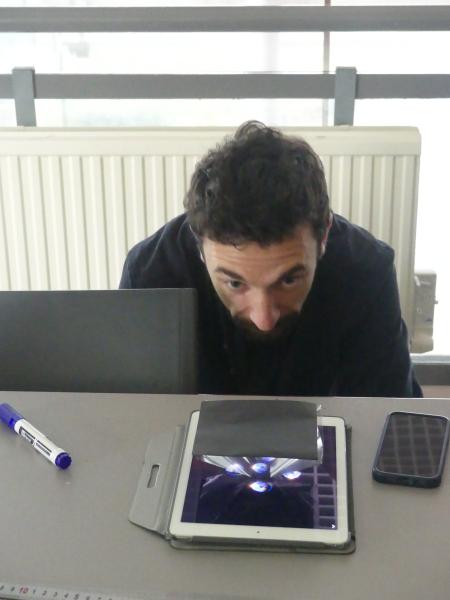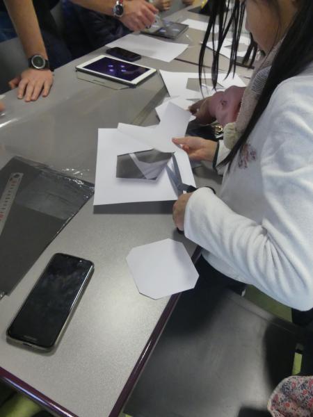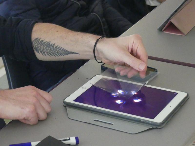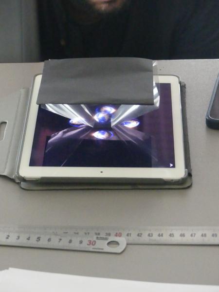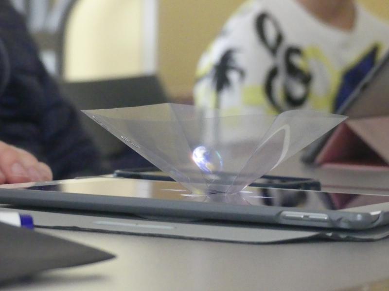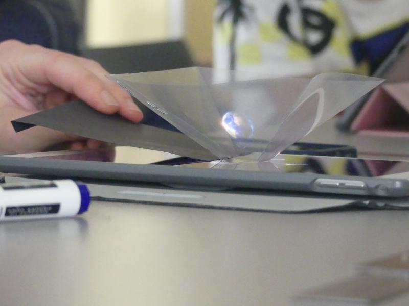 Tout d’abord les enfants ont dû découper et assembler des prismes en plastique transparent. Une fois ces petites structures réalisées, ils ont placées ces supports au centre de leurs téléphones ou de leurs tablettes devenus des projecteurs holographiques.