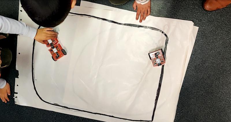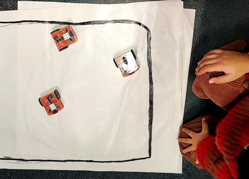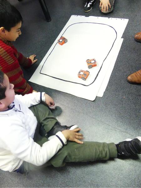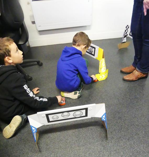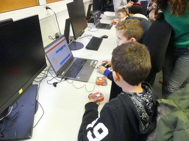 Par groupe de 2 ou 3, ils ont pu tester différentes programmations à l’aide de lecture de codes barres : combats de sumos, éviter les obstacles, courses en ligne (en tapant dans les mains : 1 coup, le robot tourne, 2 coups, il avance).
