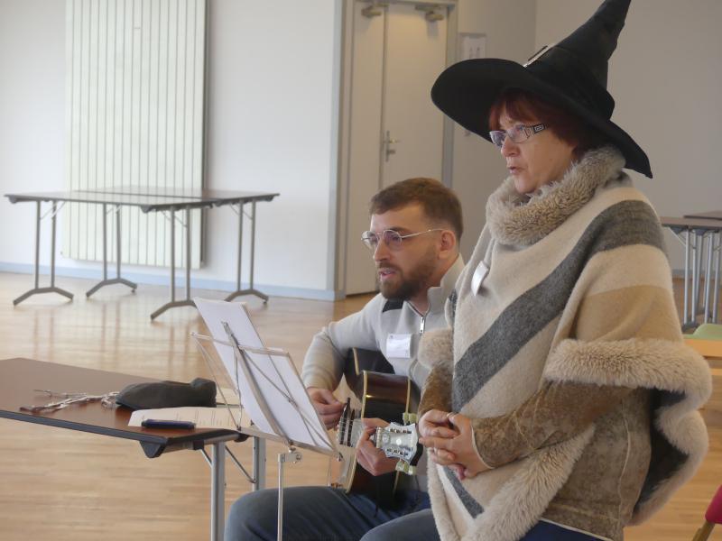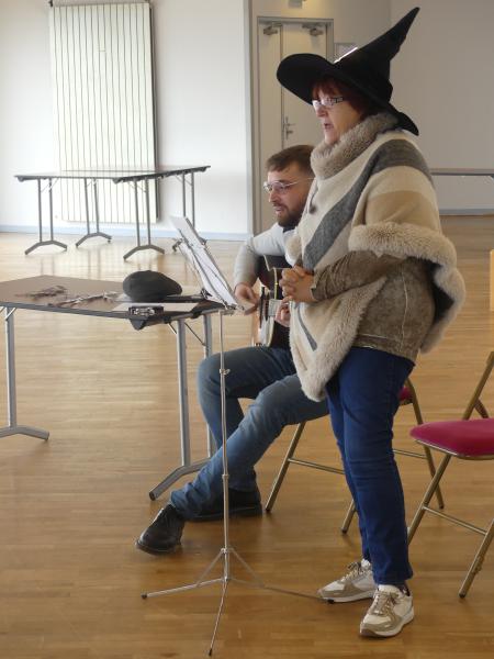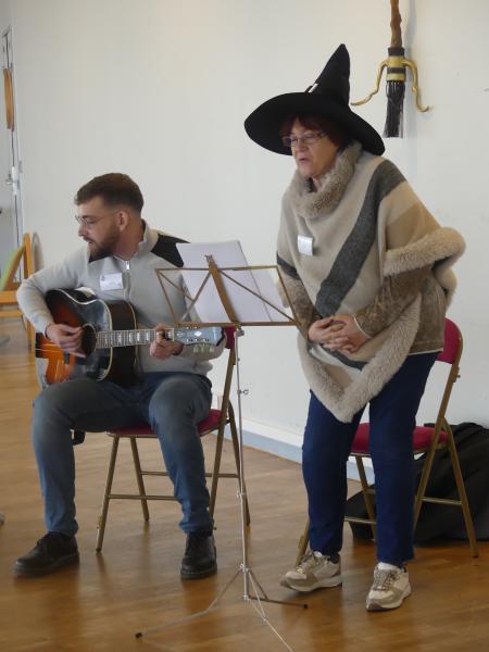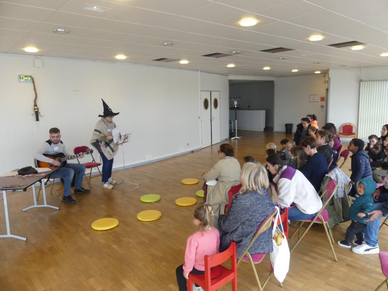 Le mercredi 25 octobre avaient lieu les comptines d’Halloween. Nos deux bibliothécaires : Nadine (au chant) et Jérémy (à la guitare) ont fait voyager enfants et parents au son de petites chansons.