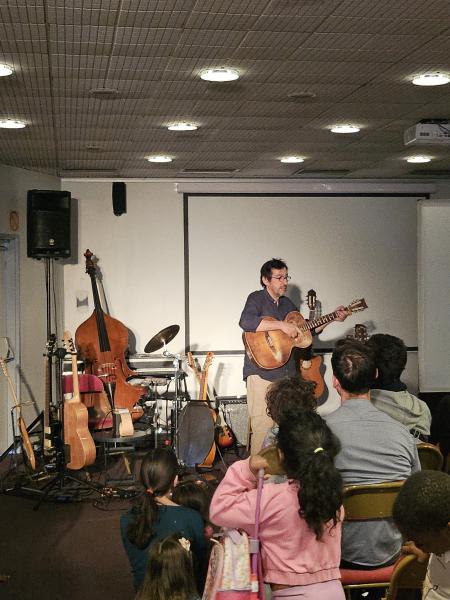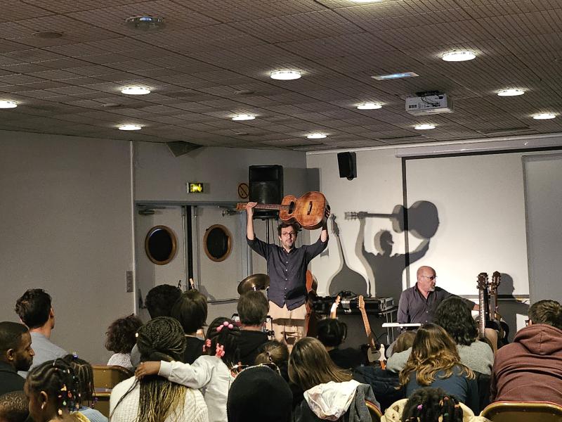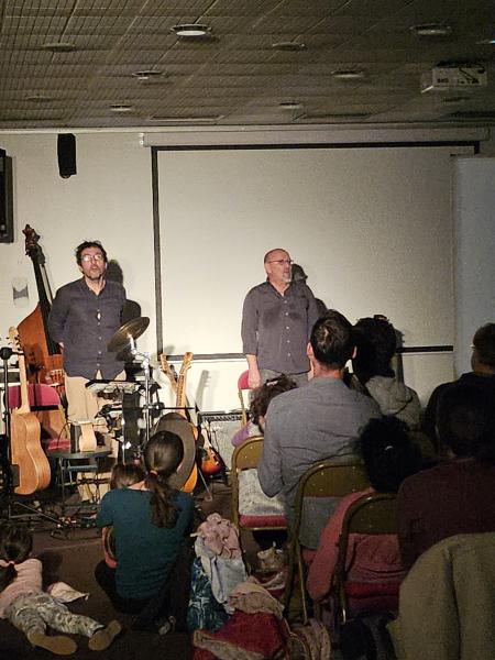 Sur une scène envahie d’instruments de musique, Séphane Arbon et Christophe Bardon ont créé une bande son originale pour Pagaille au potager : une aventure où notre héros rencontre les petits bêtes du jardin, pour le meilleur… et pour le pire !