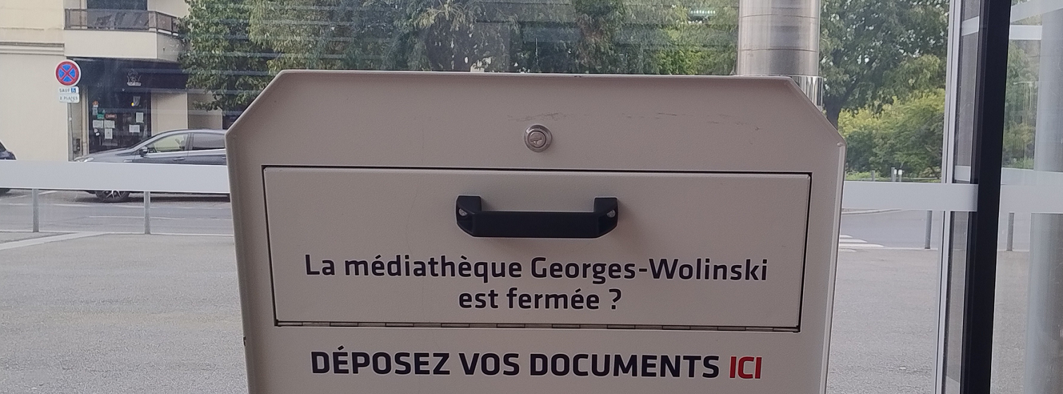 Une boîte de retour est à votre disposition dans le hall de l'Espace Michel-Simon, accessible du mardi au samedi, de 10h à 18h. Cette boîte est sécurisée, relevée quotidiennement par l'équipe de la médiathèque et vous pouvez donc y déposer vos livres, CD et DVD en toute confiance !